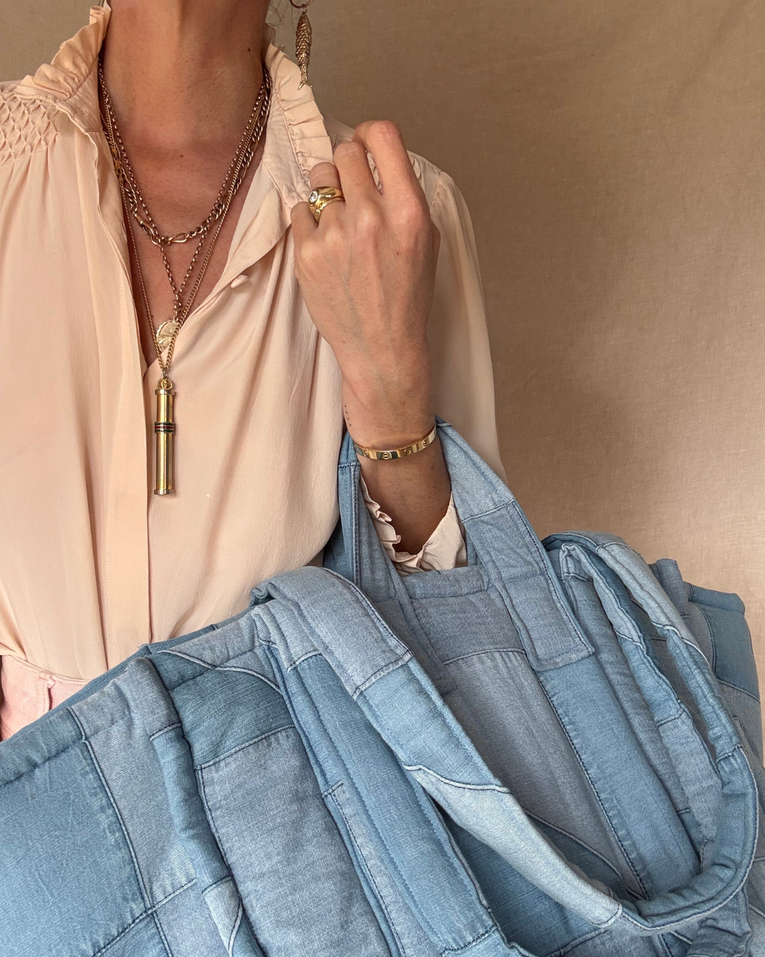 Patchwork denim tote bag. Fully padded (straps and handles included) for strength and comfort. Inner pocket for smaller items and valuables.