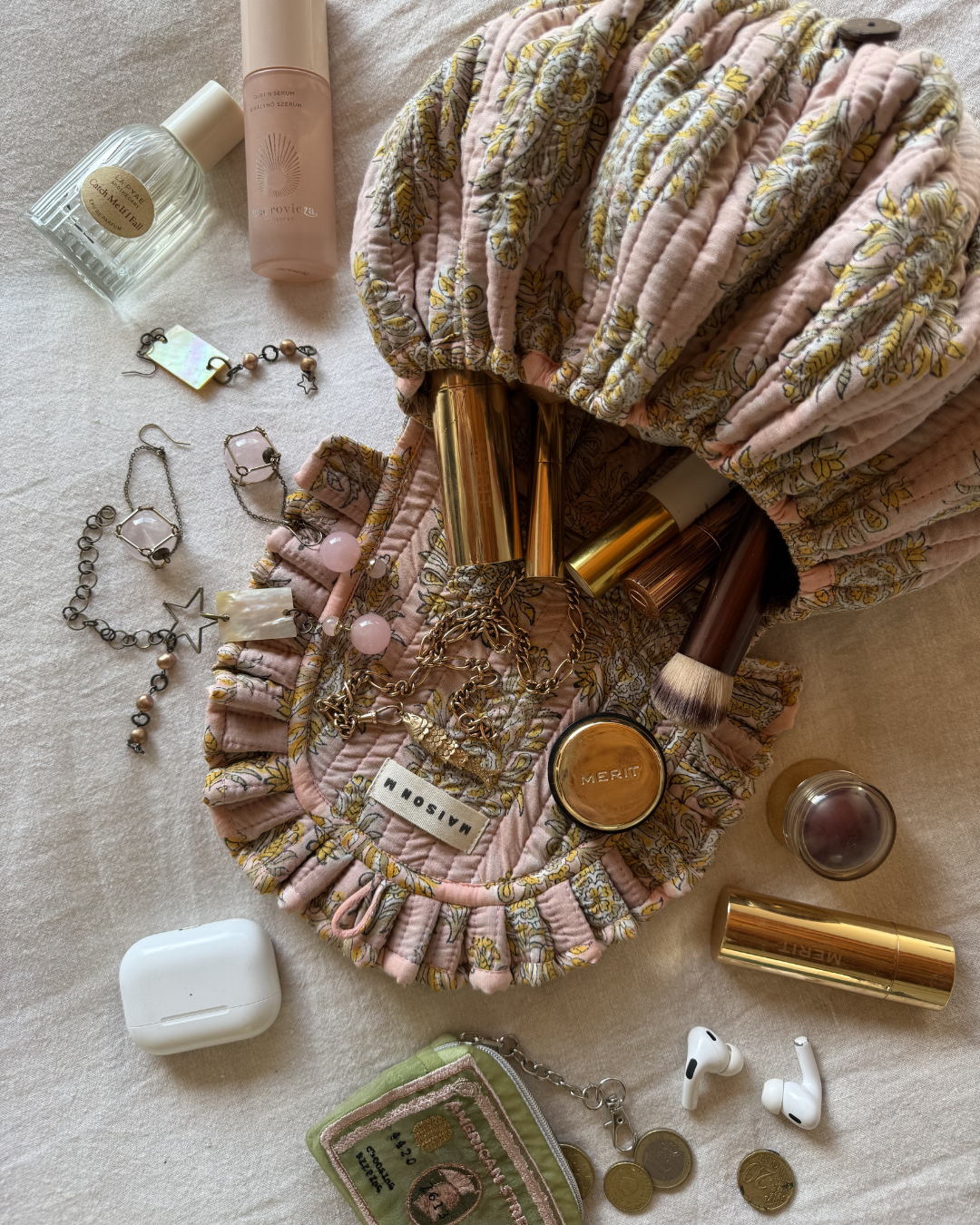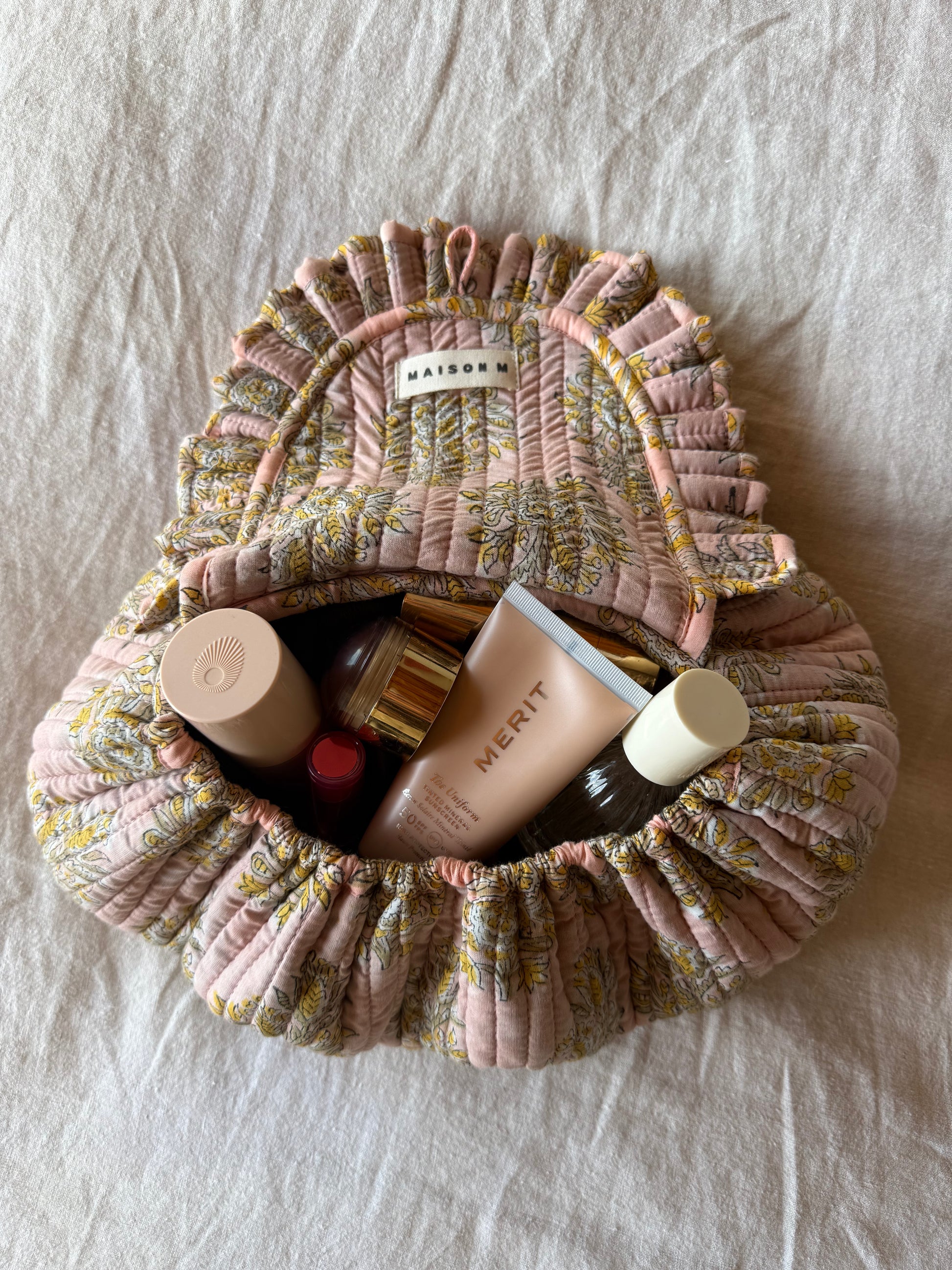 Quilted block print pouch -perfect for toiletries, make up, underwear or as a small spring/summer clutch.
