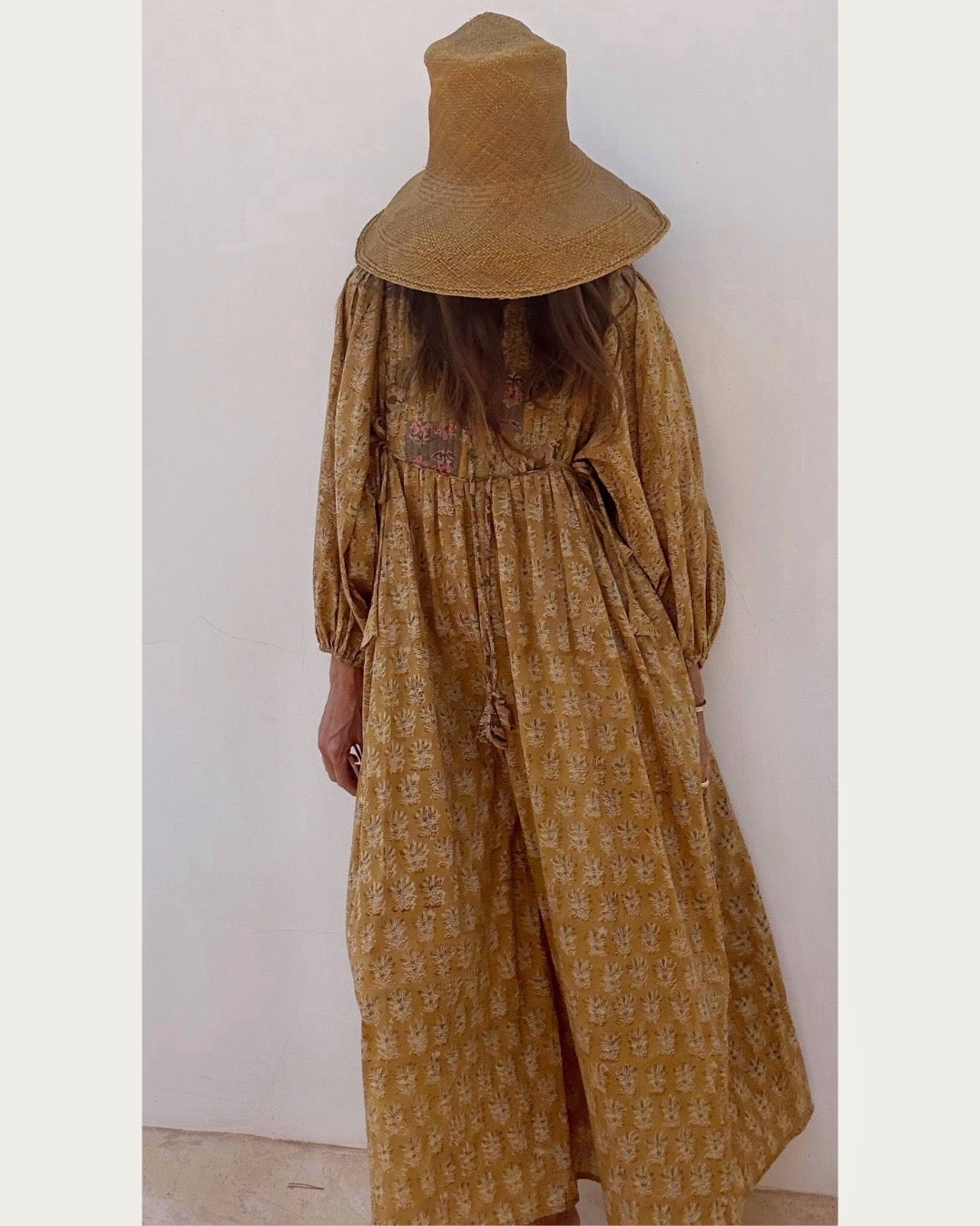 100% cotton dress with patchwork quilted bodice, side ties to alter the fit and pockets.